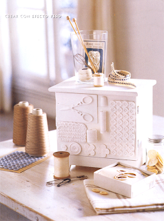 Essa ideia simples e inspiradora é muito fácil de ser executada! Basta uma caixa de mdf, tinta branca e ítens de costura de sua preferência. Com a caixa ainda sem pintura, vc cola os adornos que escolheu (botões, sinhaninhas...) e pinta tudo de branco. Plin! Prontamente linda e ao alcance das mãos!
